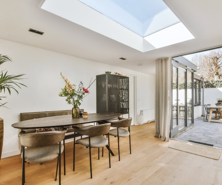 If your side return is narrow or doesn’t face much light, a skylight roof is a game-changer. It brings in sunlight from above and transforms the space below into a bright, inviting zone, perfect for kitchens, offices, or living areas.